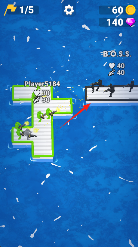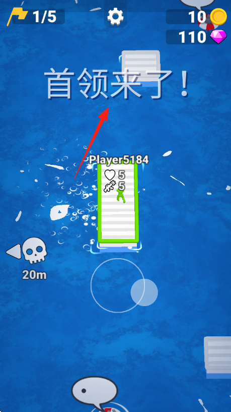 1、開(kāi)局提示首領(lǐng)來(lái)了,操控Player5184,在水上木板移動(dòng),按紅箭頭方向,靠近目標(biāo),注意金幣、鉆石積累,規(guī)劃路線(xiàn)。