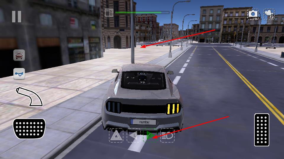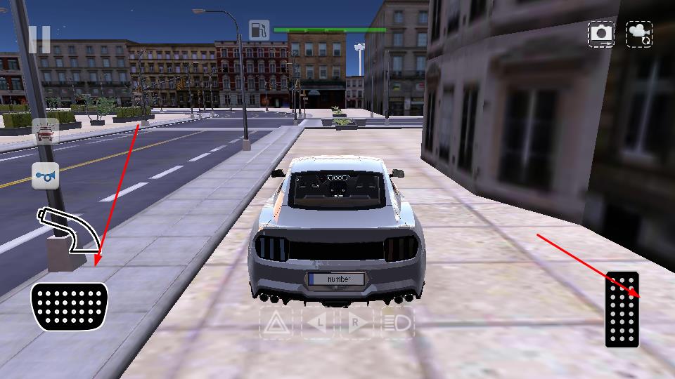 2、駕駛時(shí)左側(cè)踏板控制油門加速,右側(cè)踏板控制剎車減速,左側(cè)轉(zhuǎn)向圖標(biāo)調(diào)整行駛方向,中間按鍵切換燈光、視角等功能,留意頂部油量表狀態(tài)。
