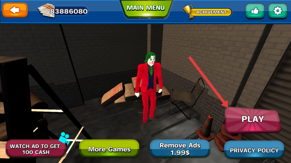 1、主界面點(diǎn)擊紅色PLAY按鈕啟動(dòng)游戲,可先通過WATCH-AD-TO-GET-100-CASH獲取初始現(xiàn)金,也能查看ACHIEVEMENT了解成就,為后續(xù)冒險(xiǎn)做準(zhǔn)備。