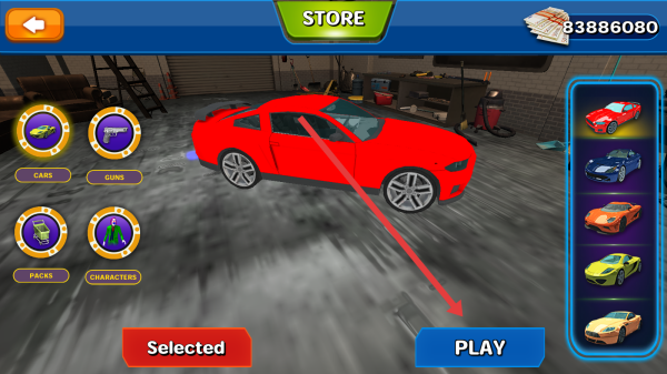2、商店界面選定紅色跑車后,點(diǎn)擊藍(lán)色PLAY按鈕,駕駛車輛進(jìn)入任務(wù)場(chǎng)景,利用車輛速度或性能完成目標(biāo),可隨時(shí)返回商店更換載具。