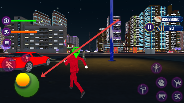 3、城市場(chǎng)景中,通過左下角虛擬搖桿操控紅色西裝角色移動(dòng),朝著綠色標(biāo)記目標(biāo)前進(jìn),結(jié)合右側(cè)技能按鈕,應(yīng)對(duì)途中出現(xiàn)的挑戰(zhàn)與敵人。