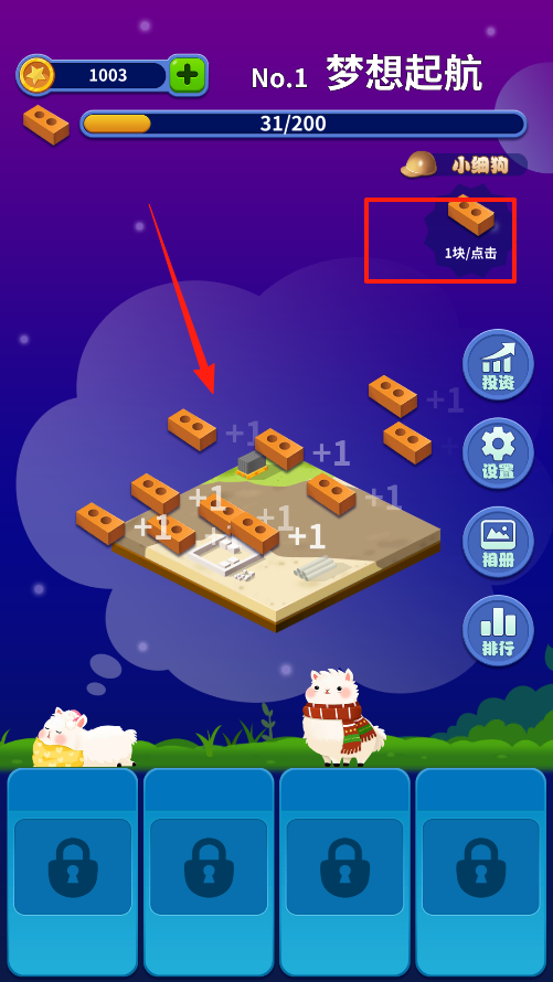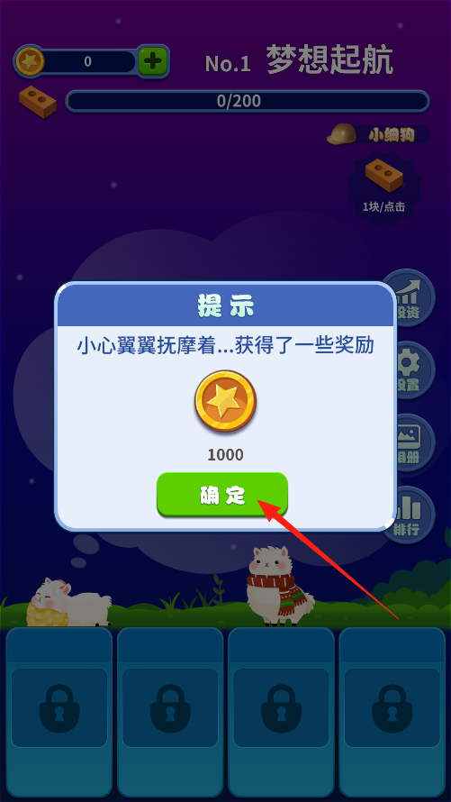 2、界面上有小狗狗點(diǎn)它每次能拿到1塊磚,拿到磚塊后磚塊會自動加到建筑進(jìn)度里,慢慢把夢想起航的建筑蓋起來,看著進(jìn)度條往前漲。