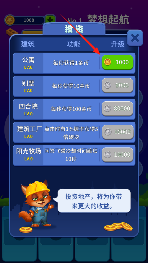 3、進(jìn)入投資界面,選公寓花1000金幣升級,升級后公寓每秒能自動賺1金幣,這樣不用一直點(diǎn)擊也能慢慢攢金幣,后面還能投資更貴的建筑。