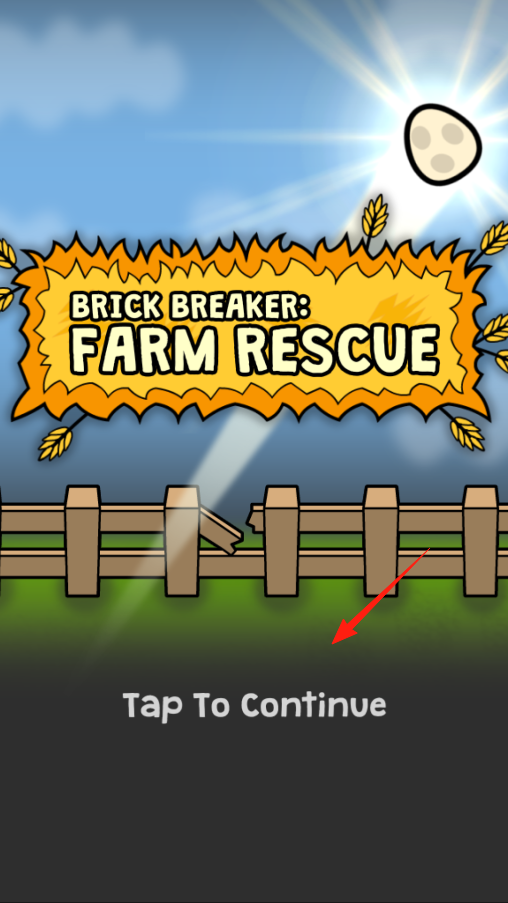 1、游戲界面顯示BRICK BREAKER: FARM RESCUE,看到下方Tap To Continue,點一下屏幕,就能進入下一段劇情,開啟農(nóng)場救援之旅。