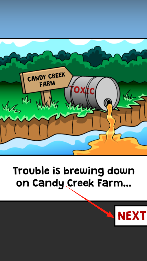 2、出現(xiàn)農(nóng)場危機漫畫,有毒桶污染河流,還有文字Trouble is brewing,點右下角NEXT繼續(xù)看后續(xù)劇情,了解農(nóng)場遇到啥麻煩,為玩游戲做鋪墊。