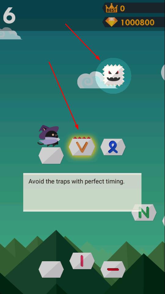 3、遭遇空中尖刺陷阱等障礙,參照提示Avoid the traps with perfect timing,把握時(shí)機(jī)點(diǎn)擊符號(hào)方塊,規(guī)避危險(xiǎn),向更高分?jǐn)?shù)挑戰(zhàn)。