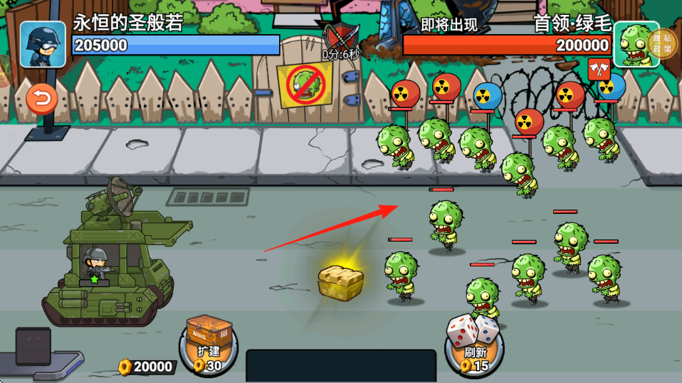 1、關(guān)卡開始,紅箭頭指向僵尸群,點擊擴建強化坦克,或刷新調(diào)整僵尸波次,利用坦克自動攻擊,消耗僵尸血量。