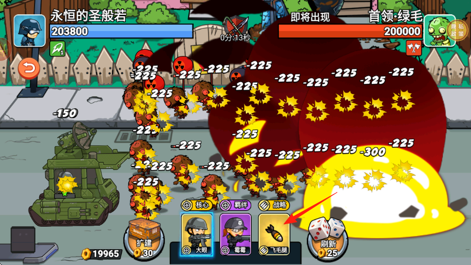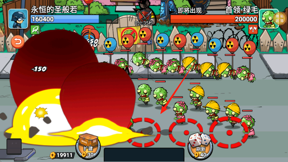 3、持續(xù)攻擊,紅箭頭標記新僵尸戴花、安全帽,釋放技能爆炸范圍-150,清理威脅,保護基地血量,完成波次,獲取金幣。