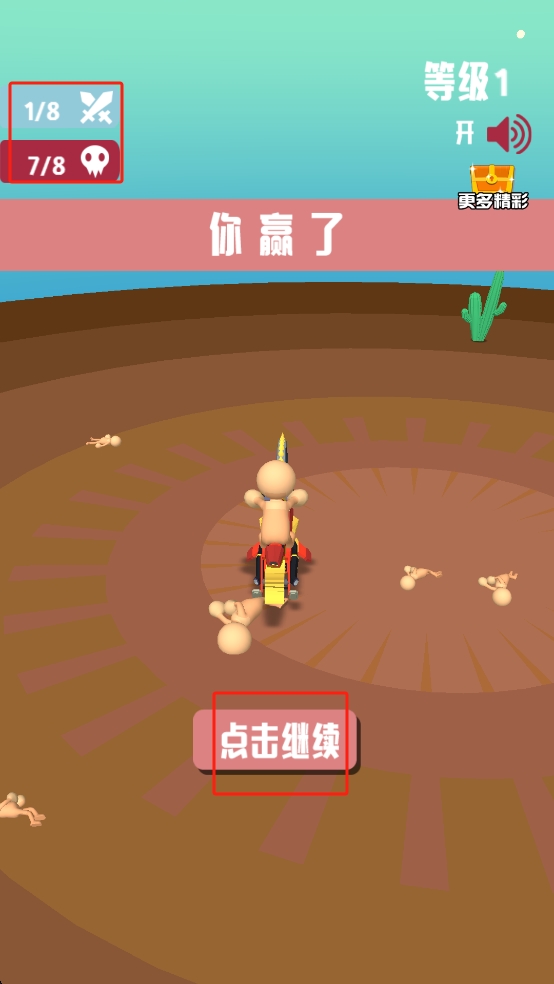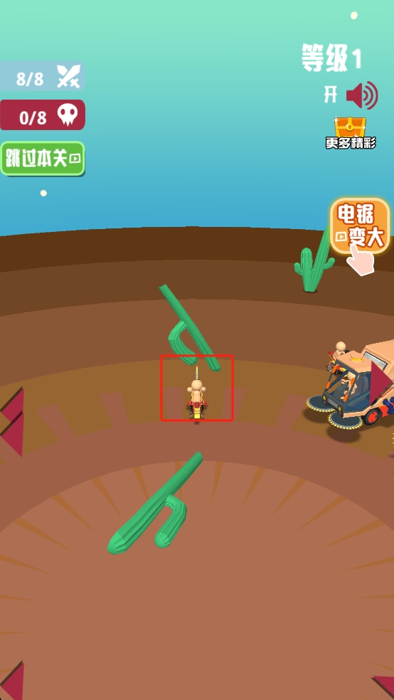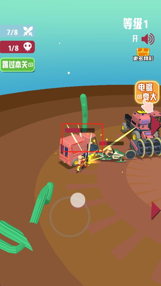 1、操控摩托角色在沙漠場(chǎng)景行動(dòng),留意周圍仙人掌障礙,通過擊殺不斷變大,向敵方單位發(fā)起進(jìn)攻。