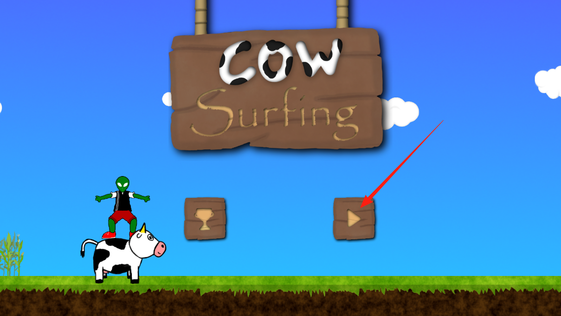 1、在主界面看到Cow Surfing,點(diǎn)右邊帶三角箭頭的木牌按鈕,就能開始游戲,讓外星人騎著奶牛在草地上沖浪闖關(guān)。