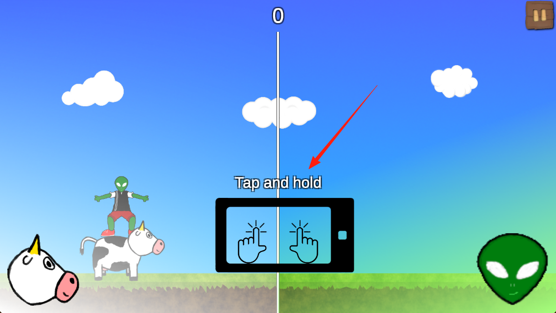 2、屏幕中間有Tap and hold提示,按照說明點(diǎn)擊并長按屏幕,控制外星人騎的奶牛跳躍,避開兩邊出現(xiàn)的外星人獨(dú)角獸這些障礙,別讓奶牛掉下去。