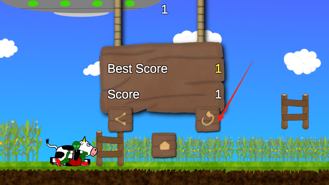 3、游戲結(jié)束后,顯示Best Score和Score,想再玩一輪點(diǎn)右邊帶循環(huán)箭頭的木牌按鈕,重新開始挑戰(zhàn)更高分?jǐn)?shù),看看這次能讓奶牛跑多遠(yuǎn)。