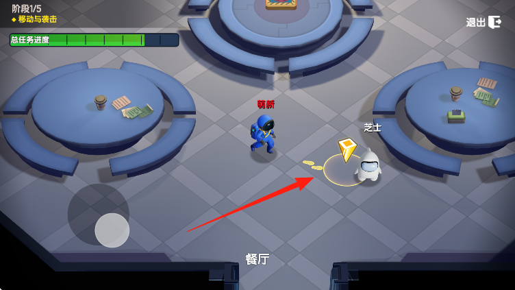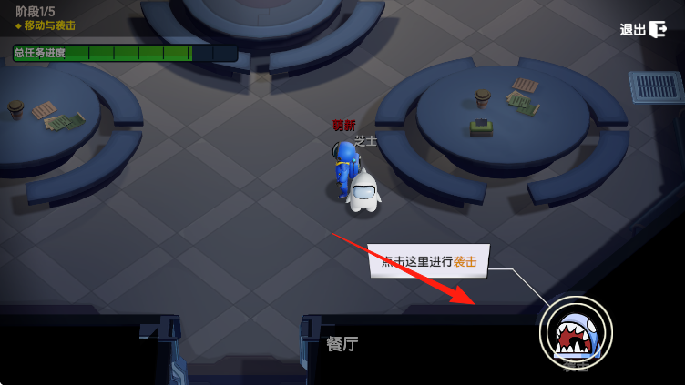 1、內鬼視角,階段1/5移動與襲擊,在餐廳,操控萌新靠近芝士,紅箭頭指引,準備襲擊,注意總任務進度避開船員。
