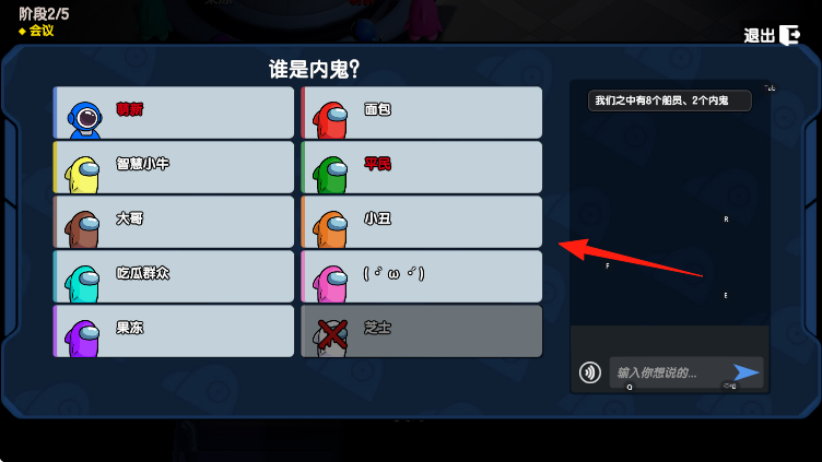 3、階段2/5會議,芝士被淘汰,進入投票,紅箭頭指存活船員8船員、2內鬼,內鬼萌新需偽裝,誣陷他人,引導投票,保護隊友。