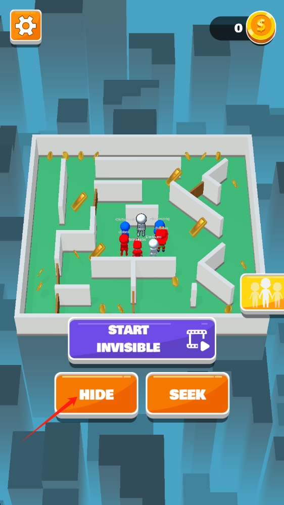 1、在游戲模式選擇界面,根據(jù)喜好選擇HIDE或SEEK模式,若選擇HIDE模式,可點(diǎn)擊START-INVISIBLE獲得隱形優(yōu)勢(shì)。