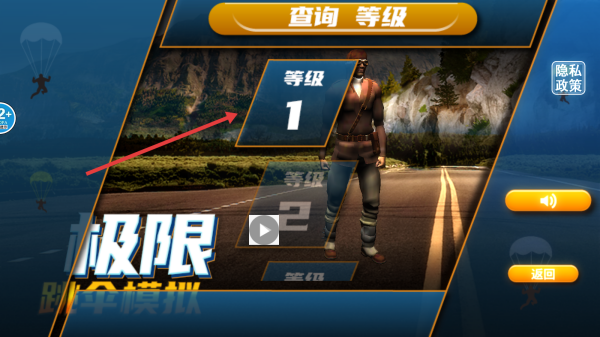 1、進(jìn)入游戲,點(diǎn)擊開始按鈕,選等級1開局,操控角色從飛機(jī)起跳,緊盯紅色圓環(huán)軌跡飛行。