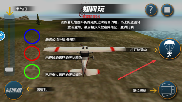 2、飛行時(shí)調(diào)飛機(jī)姿態(tài),用復(fù)位傾斜,減速板,穿紅、藍(lán)圓環(huán)攢分?jǐn)?shù),留意圓環(huán)顏色紅未穿、綠已穿,保證穿環(huán)數(shù)量。