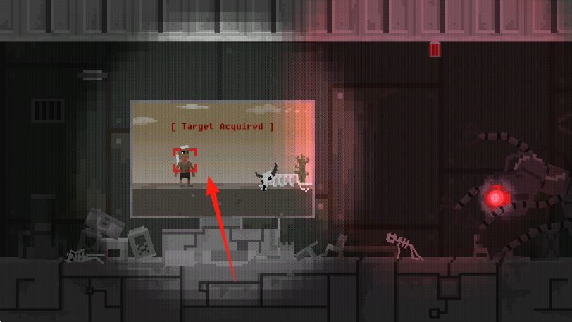 1、在廢土場(chǎng)景操控像素人按紅箭頭靠近TargetAcquired目標(biāo)觸發(fā)交互獲取任務(wù)推進(jìn)劇情。