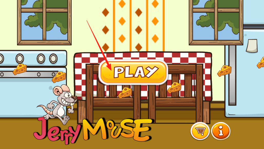 1、打開(kāi)老鼠大戰(zhàn)二貓,點(diǎn)擊play按鈕就能開(kāi)始幫杰瑞鼠冒險(xiǎn)啦,界面里還有小老鼠和奶酪,準(zhǔn)備好進(jìn)入抓奶酪、躲敵人的有趣關(guān)卡吧。