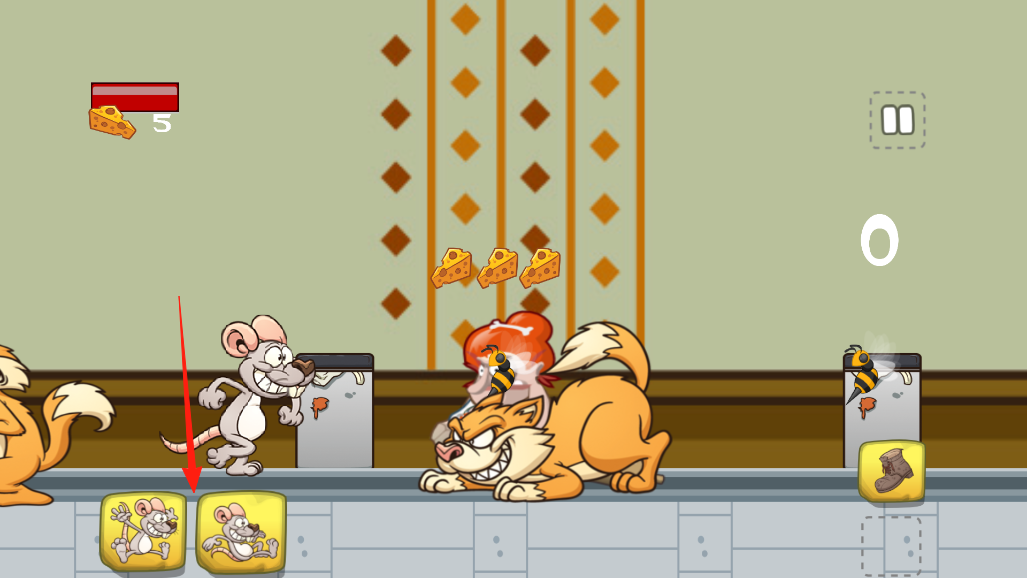 2、杰瑞鼠在場(chǎng)景里跑,要收集天上掉的奶酪,下面有不同技能按鈕,遇到像貓蜜蜂這些敵人,點(diǎn)對(duì)應(yīng)的技能圖標(biāo),幫杰瑞躲開(kāi)危險(xiǎn),繼續(xù)往前沖。