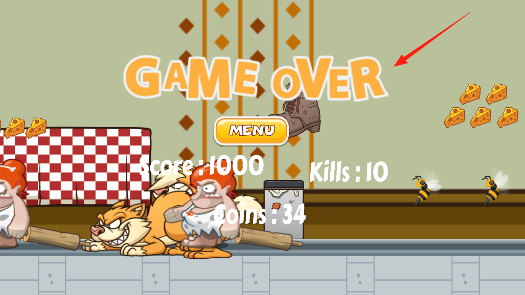 3、要是杰瑞被敵人抓住,游戲就結(jié)束咯,這時(shí)能看到自己的分?jǐn)?shù)、消滅敵人數(shù)量和得到的金幣,想重新挑戰(zhàn),就點(diǎn)MENU回到主界面,再開(kāi)一局,爭(zhēng)取這次表現(xiàn)更好。