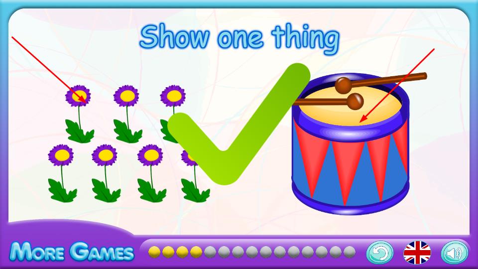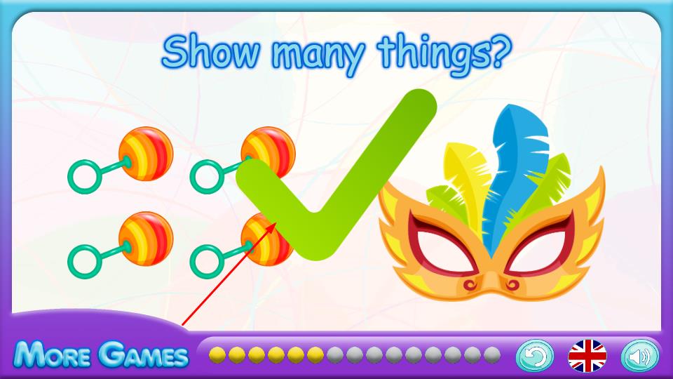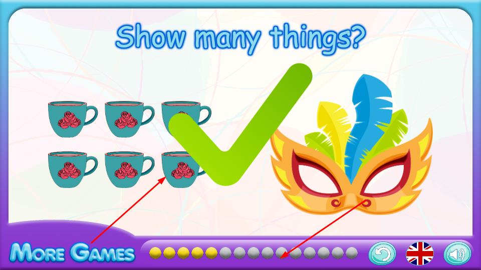 2、識別界面左右區(qū)域物品,數(shù)清左側(cè)目標(biāo)物品數(shù)量如首關(guān)紫色花朵1朵、后續(xù)藍(lán)色杯子6個(gè)、彩色撥浪鼓4個(gè),計(jì)數(shù)正確時(shí),中間彈出綠色對勾確認(rèn)。