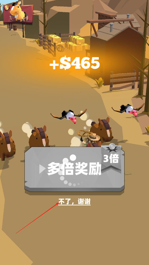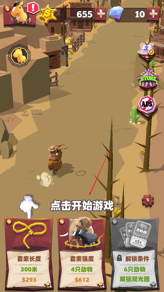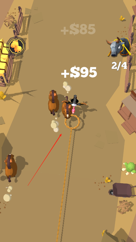 1、點擊屏幕,牛仔則會拋出繩索,繩子到達極限長度的時候,會收回,在收回過程中捕捉動物。