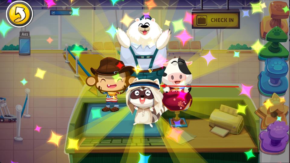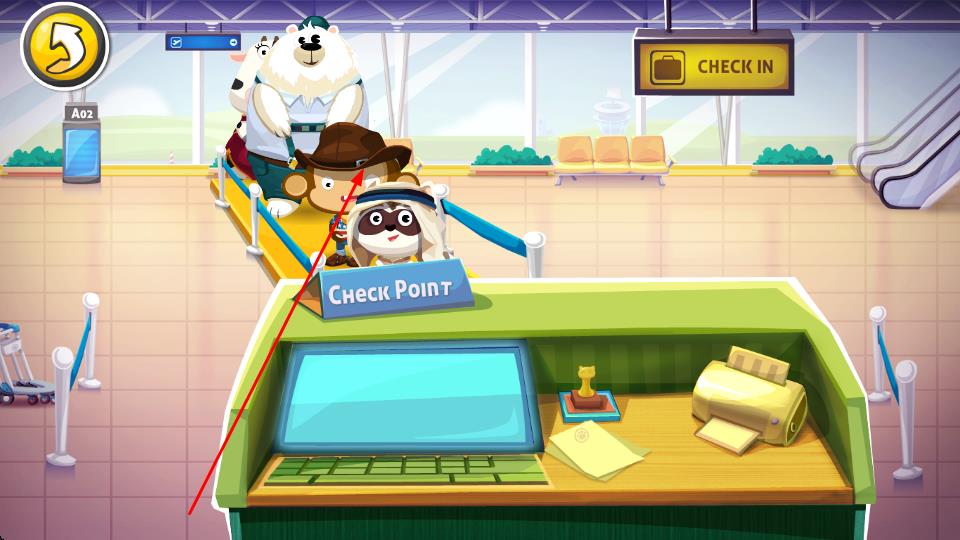 1、進入機場值機場景,猴子、白熊、奶牛等動物在傳送帶排隊,點擊隊列中動物,觸發(fā)護照檢查流程。