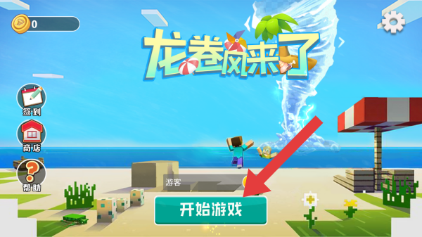 1、畫面呈現(xiàn)了簽到、商店等功能圖標,以及沙灘的場景,玩家可點擊開始游戲方可進入場景進行游玩。