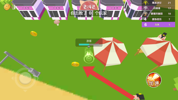 3、每位玩家代表了不同的龍卷風,需要拾取地圖上的金幣增強自己的力量,再去吞噬其他微小的龍卷風。