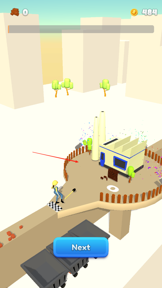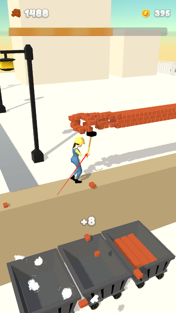 1、長按即可操縱小姐姐揮動(dòng)手中的鐵錘擊打空中的磚塊,磚塊會(huì)收集到旁邊的礦車?yán)铩?