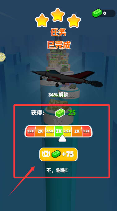 4、達成任務(wù)目標(biāo)后,進入獎勵結(jié)算界面,可選擇獎勵加成或繼續(xù)闖關(guān)。