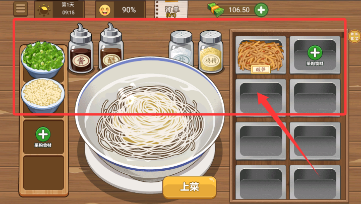 3、根據(jù)訂單內(nèi)容,在料理臺選取對應(yīng)配料,加入主食進(jìn)行烹飪加工。