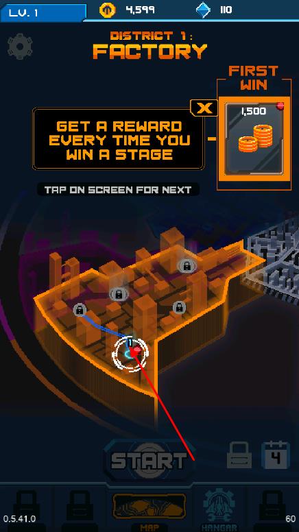 1、進入游戲,在關(guān)卡選擇界面,選擇可進入的區(qū)域,點擊START按鈕,在場景中,通過下方的虛擬操作按鈕,控制飛機的移動方向。