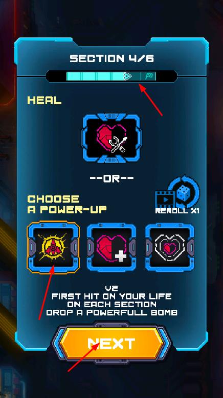 3、在關(guān)卡之間的界面,根據(jù)提示,選擇治療或選擇增強道具,點擊NEXT按鈕,進入下一個區(qū)域。