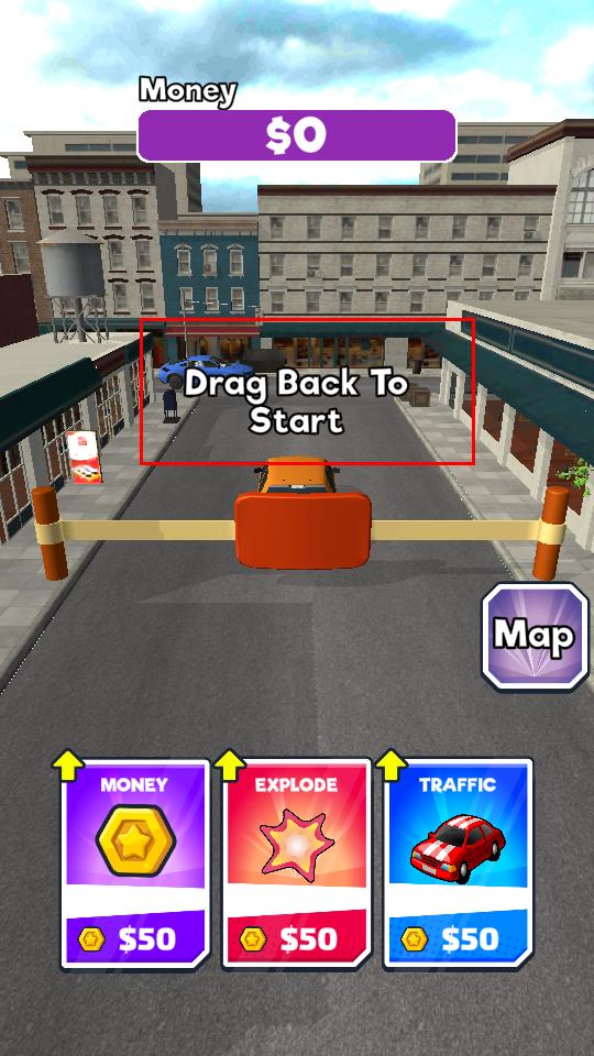 1、拖動(dòng)橙色車(chē)輛完成Drag Back To Start蓄力操作,下方MONEY獲金幣、EXPLODE爆炸技能、TRAFFIC召喚車(chē)輛按鈕可花費(fèi)金幣解鎖,點(diǎn)擊右側(cè)Map查看場(chǎng)景。