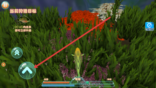 2、注意當(dāng)前的狩獵任務(wù),根據(jù)目標(biāo)魚特征包括外形和位置 ,在海草區(qū)搜索,利用沖刺快速接近,完成擊殺升級。