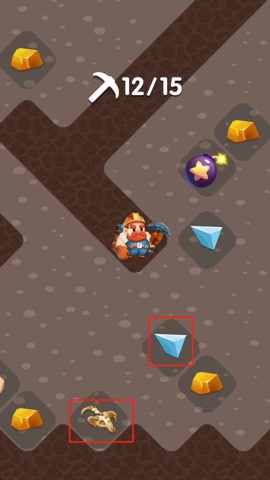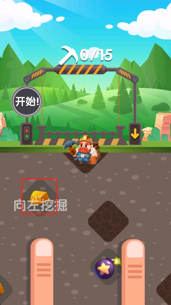1、點(diǎn)擊開始后,操控角色向左挖掘,優(yōu)先挖紅框內(nèi)金礦,按挖掘進(jìn)度0/15推進(jìn),遇到炸彈等道具合理利用。