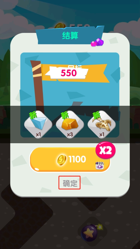 3、結(jié)算界面出現(xiàn)后,點(diǎn)擊確定領(lǐng)取1100金幣及新礦石獎(jiǎng)勵(lì),積累資源用于升級(jí)工具、解鎖新礦區(qū)。