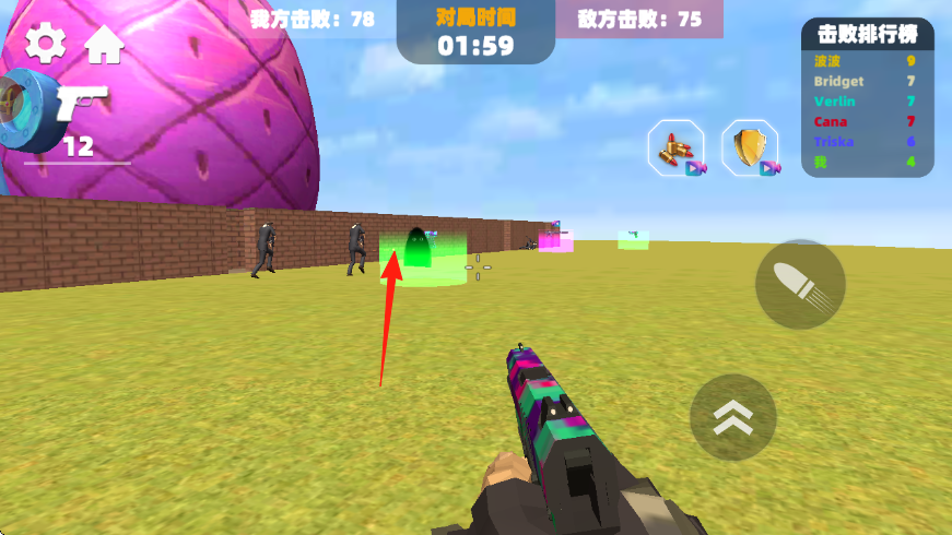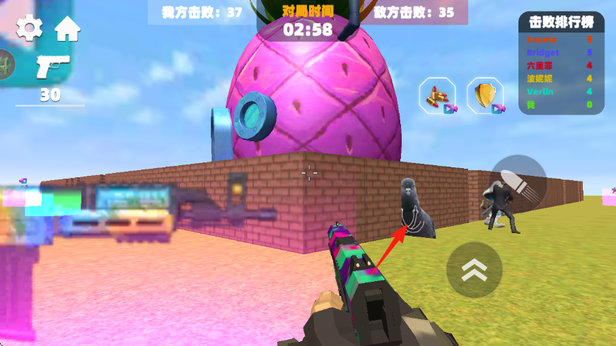 1、進入對戰(zhàn),操控角色持槍,瞄準敵方目標如海豹、西裝敵人射擊,積累我方擊敗數(shù)。