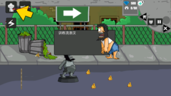 1、進(jìn)入戰(zhàn)斗,看到左上角黃色箭頭指向訓(xùn)練流浪漢的圖標(biāo),繼續(xù)點(diǎn)擊對應(yīng)的武器,可召喚或切換強(qiáng)力武器。