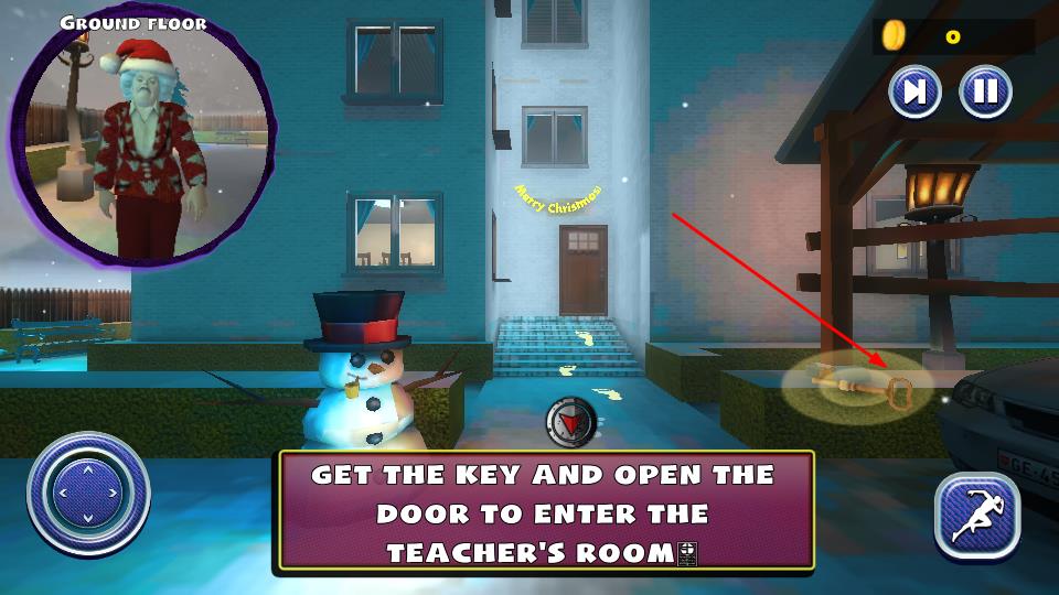 1、操控左上角身著圣誕裝的角色,拾取右側(cè)發(fā)光鑰匙,遵循提示GET THE KEY AND OPEN THE DOOR TO ENTER THE TEACHER'S ROOM,為開啟房門做準(zhǔn)備。
