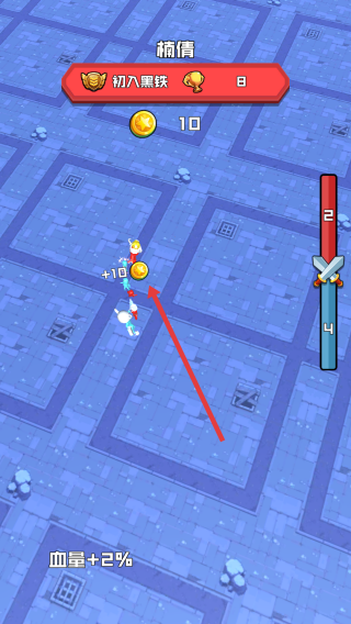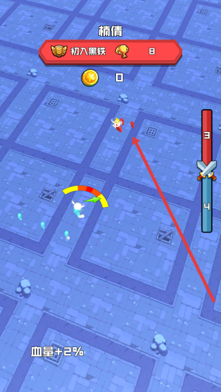 1、戰(zhàn)斗時,需要沿紅色箭頭方向來追擊敵人,靠近后進行攻擊,注意躲避敵人反擊,擊敗敵人可獲金幣。