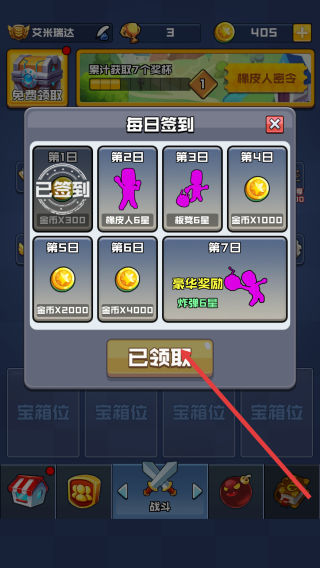 3、返回游戲界面,點擊每日簽到,領(lǐng)取對應(yīng)獎勵,第7日有豪華獎勵炸彈6星,記得每日簽到獲取資源。