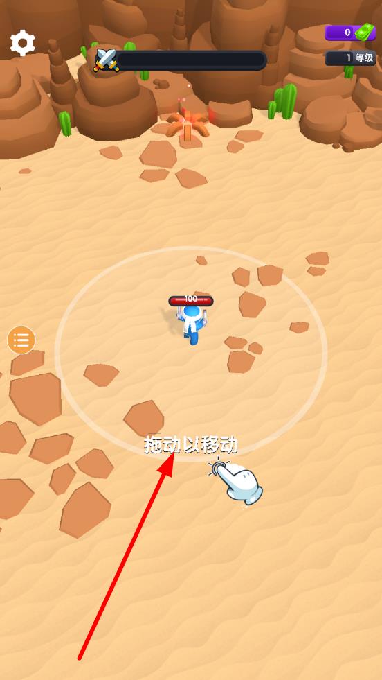 1、進入關(guān)卡,拖動屏幕操控角色移動,熟悉荒漠地形與操作手感,目標指向紅色敵人,規(guī)劃首波戰(zhàn)斗的接近路線。