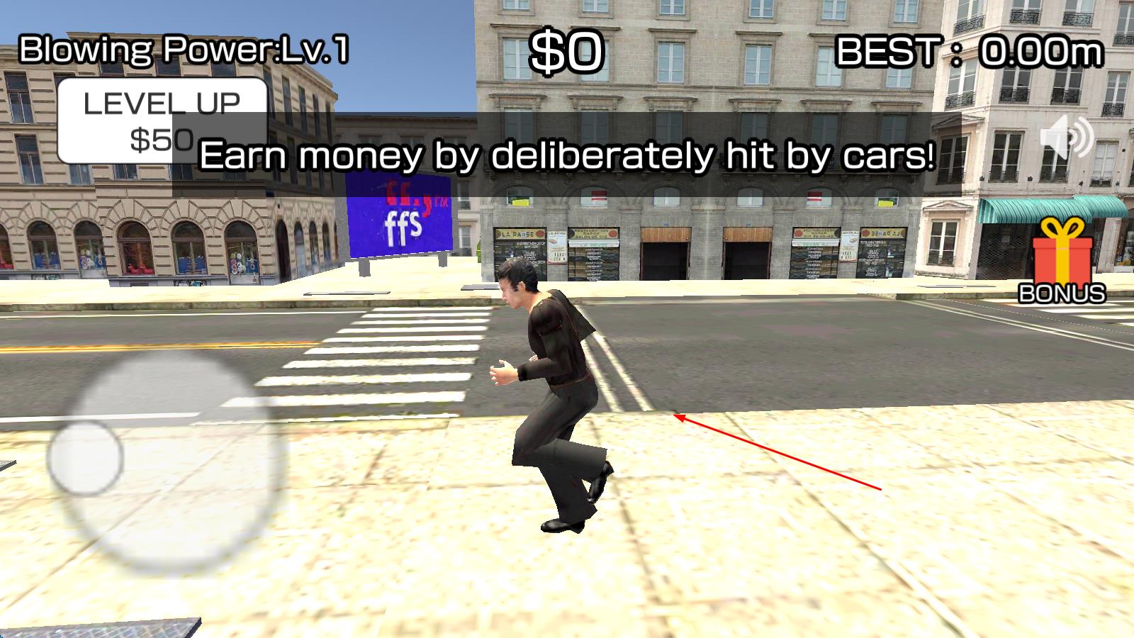 1、進入游戲后,操控角色在道路旁移動,找準時機沖向行駛的汽車,讓其撞擊自己,開啟撞車賺錢的趣味過程。