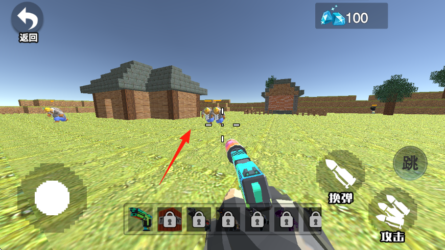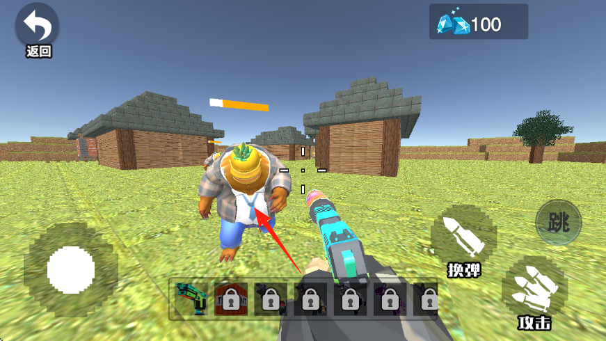 1、操控角色,用左側(cè)搖桿移動,右側(cè)攻擊按鈕射擊,瞄準(zhǔn)箭頭指向的敵人初始為小人,后為戴菠蘿帽的熊。