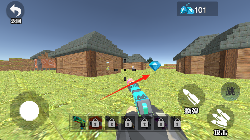 3、擊敗敵人后,出現(xiàn)鉆石道具,射擊或靠近收集鉆石數(shù)量從100變?yōu)?01,探索房屋區(qū)域,完成關(guān)卡目標(biāo)。