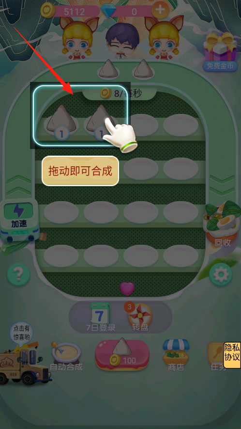 1、進入游戲界面,看到兩個相同的1級糕點,按照提示,把它們拖到一起,就能合成更高級的糕點,合成后不僅能變樣,還能讓每秒產(chǎn)出的金幣變多,慢慢攢金幣解鎖新東西。