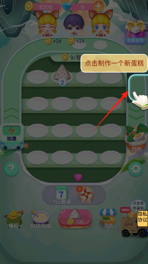 2、界面有空白位置,看到點擊制作一個新蛋糕提示,點一下空白處,消耗金幣做新糕點,新糕點會從1級開始,之后繼續(xù)合成升級,讓整個糕點隊列越來越厲害,金幣也賺得更快。
